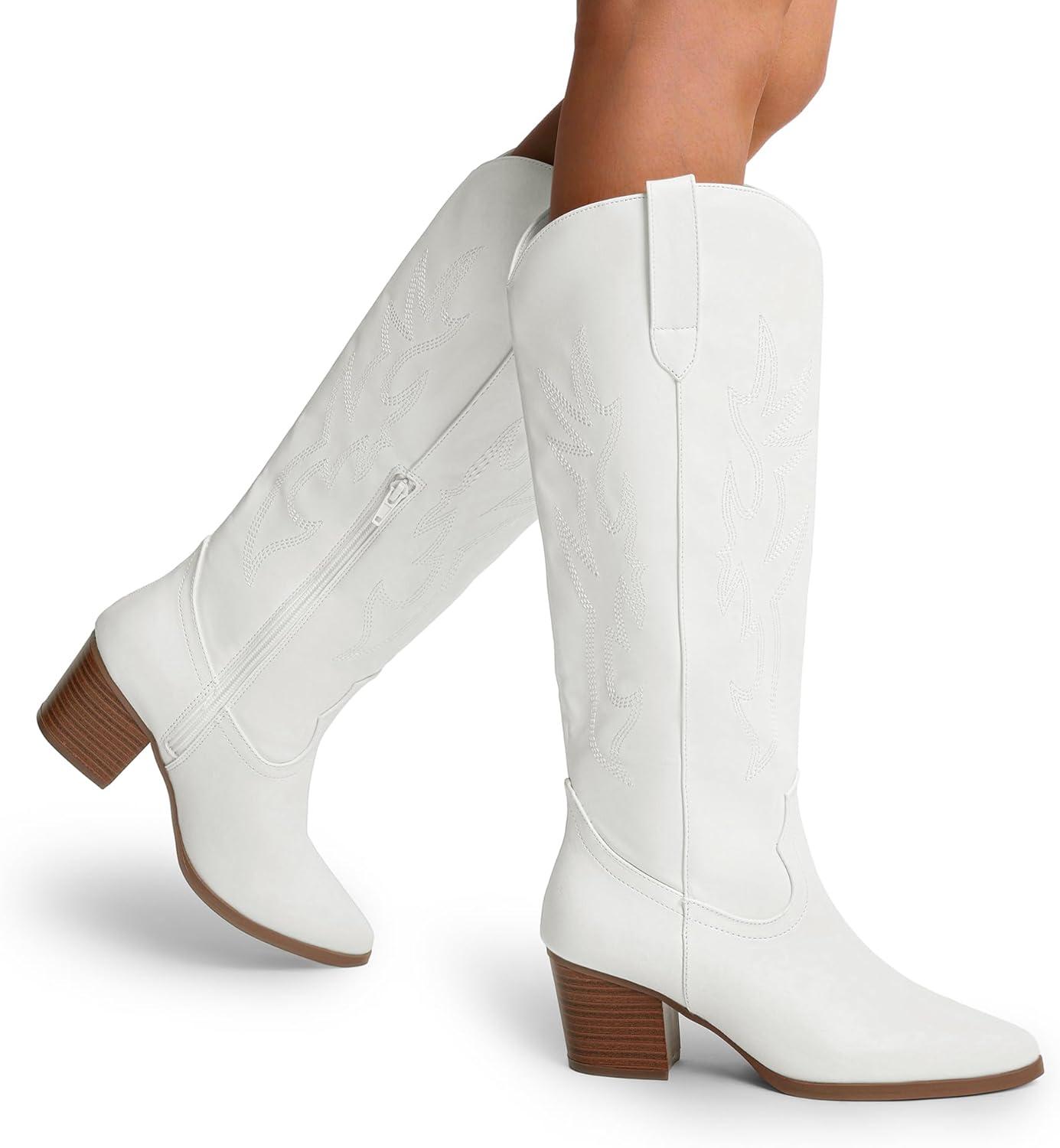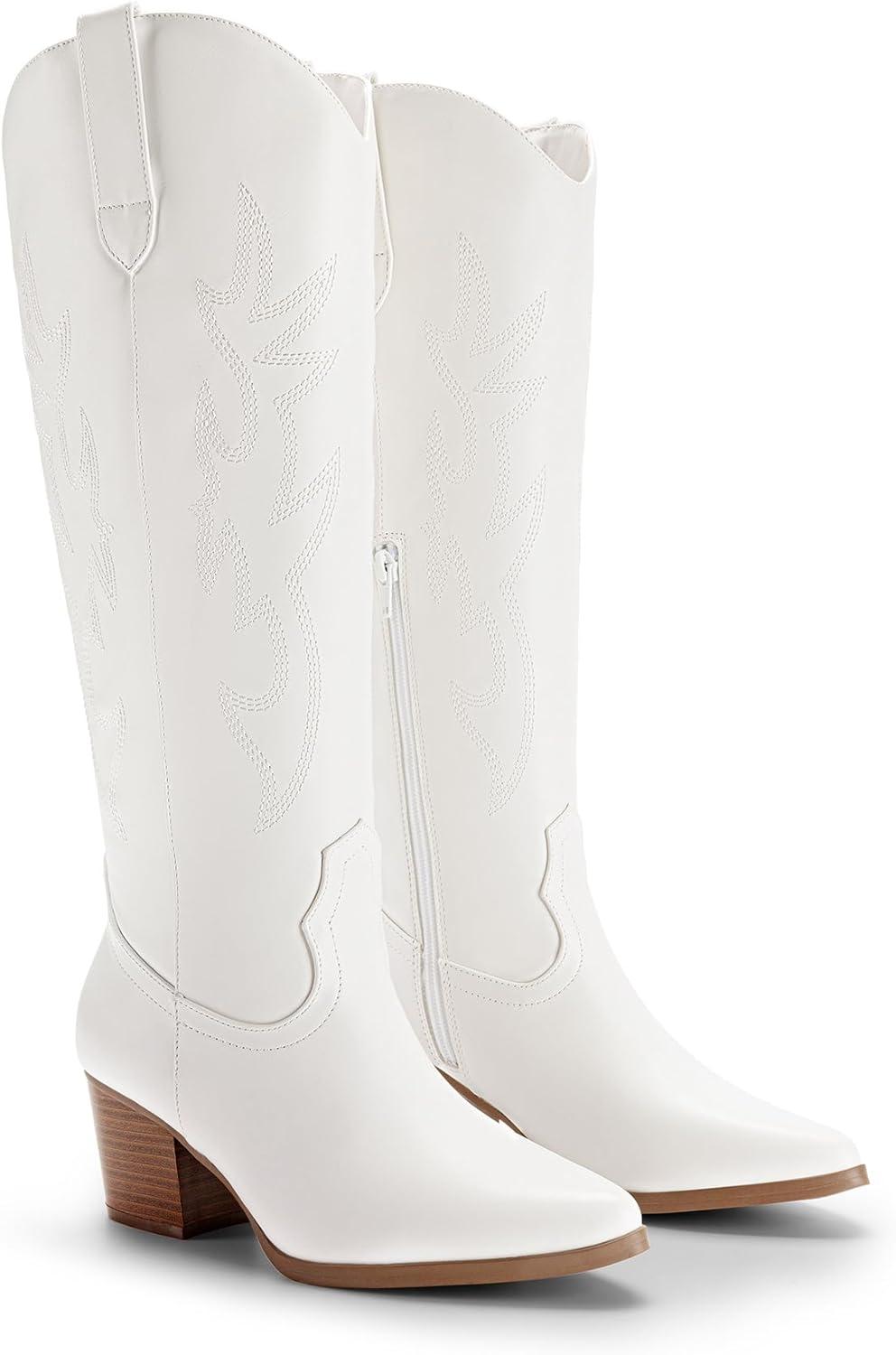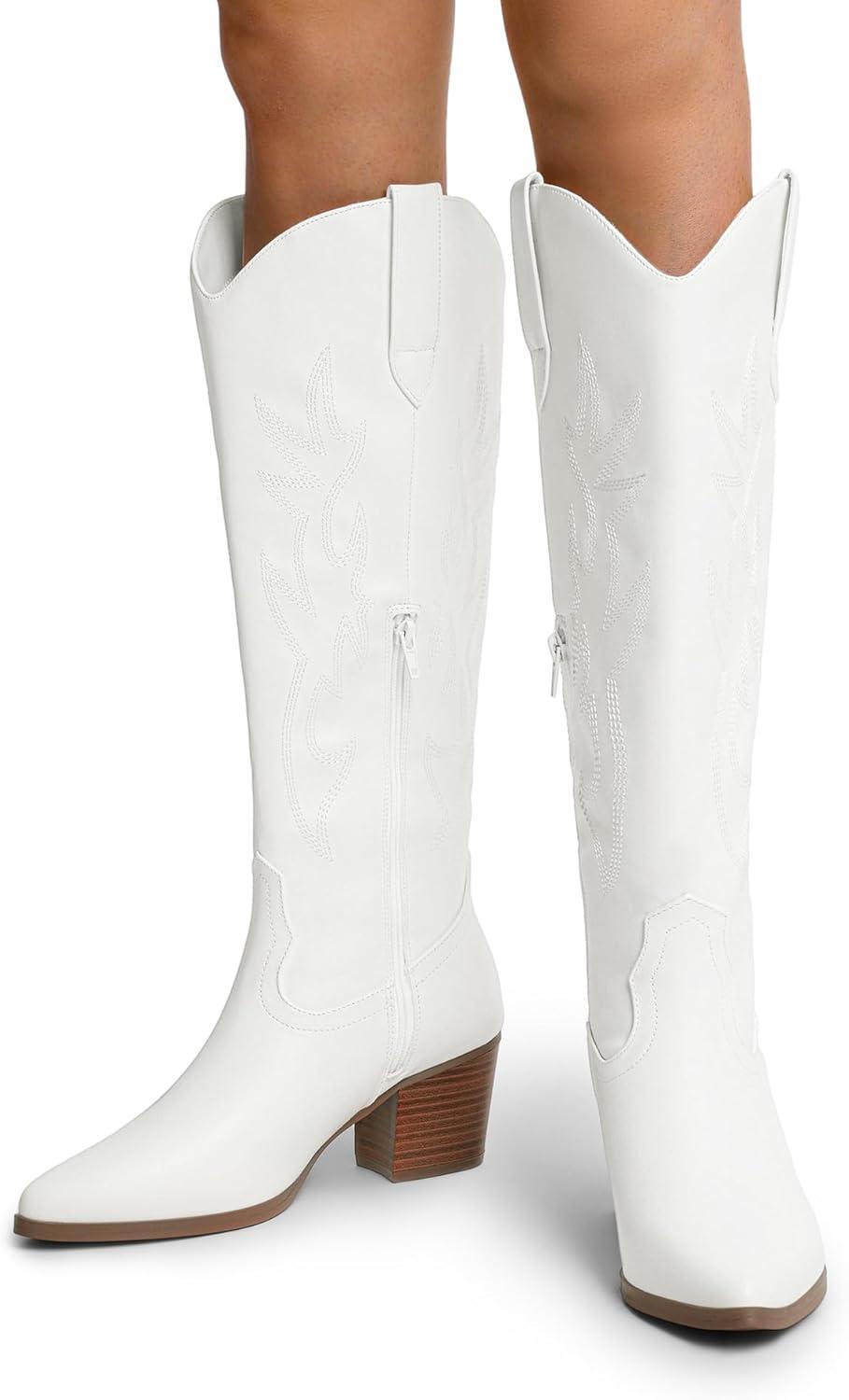 DREAM PAIRS Cowboy Boots for Women Cowgirl Knee High Boots Comfortable Pull On Zipper Chunky Heel Pointed Toe Embroidered Western Boots(White)