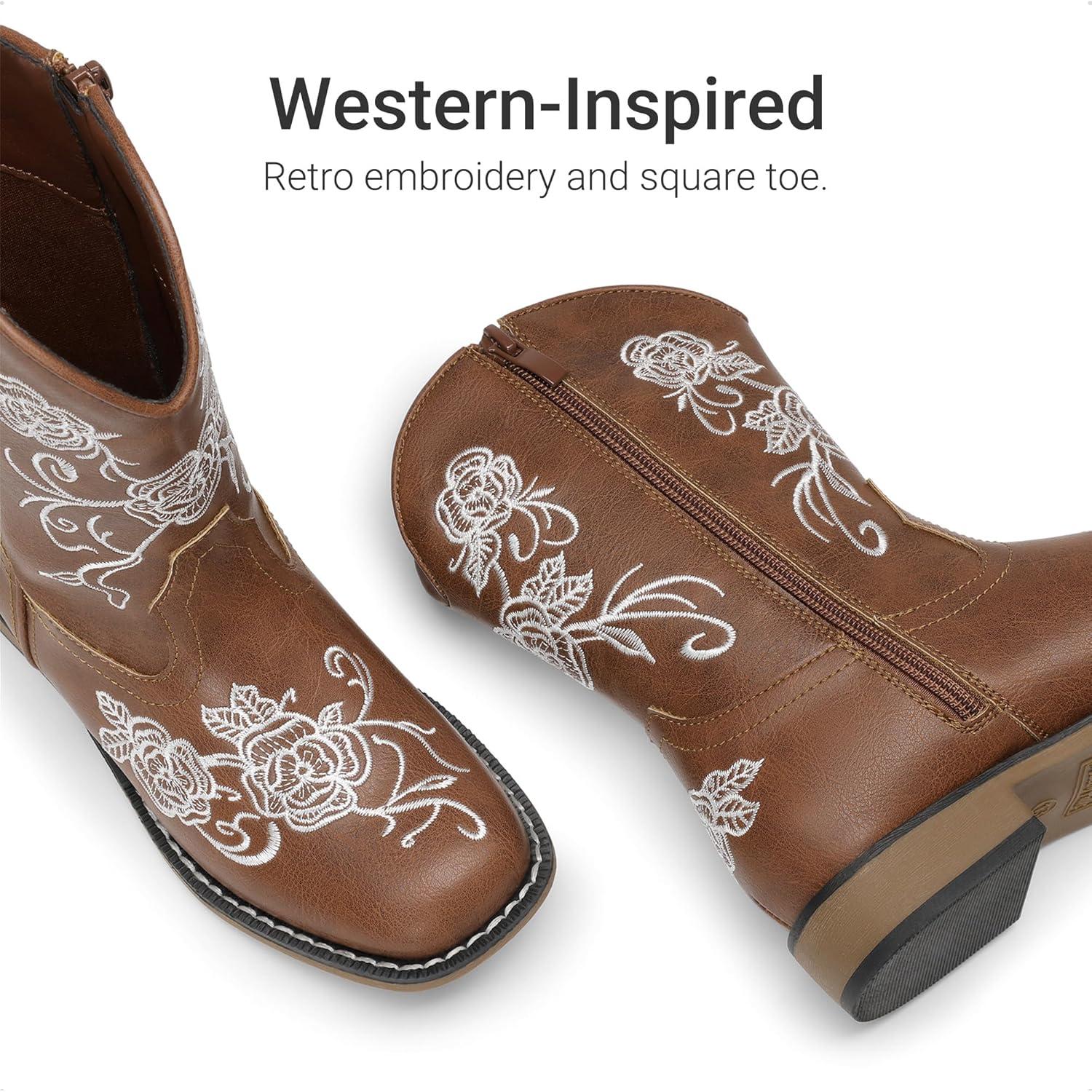 DREAM PAIRS Girls Cowboy Boots Floral Embroidered Classic Western Cowgirl Boots Square Toe Mid Calf Side Zipper Horsing Party Toddler/Little/Big Kids(Brown)