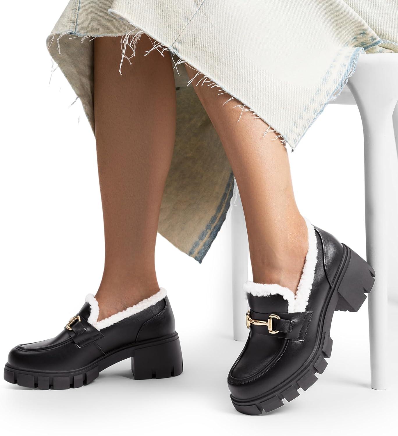 DREAM PAIRS Loafers for Women Platform Chunky Loafers Slip On Casual Shoes(Black-furry)