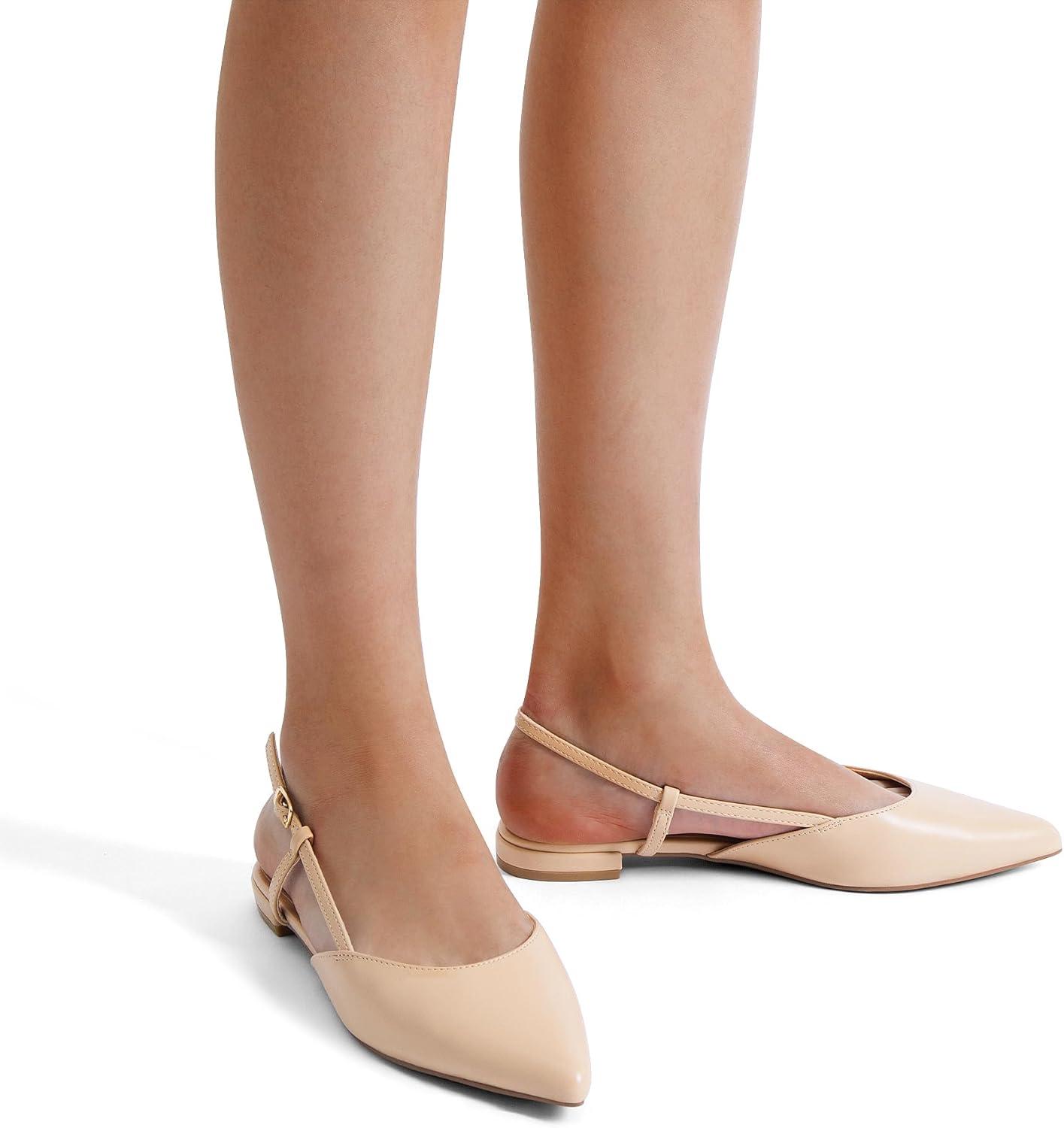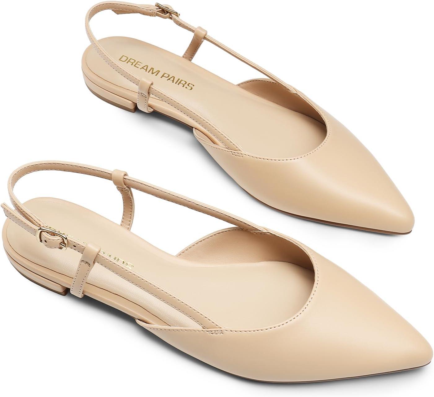 DREAM PAIRS Slingback Flats for Women, Pointed-Toe Elegant Women’s Ballet Flats with Buckle Strap, Classic Low Heel Dress Shoes for Casual Work Office Party(Nude-pu)
