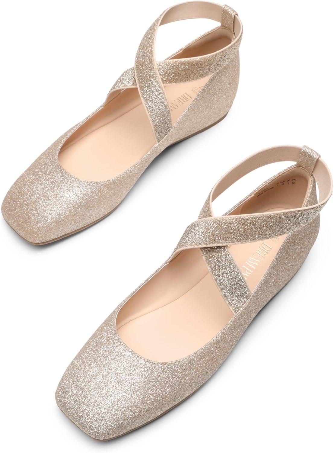 DREAM PAIRS Women’s Ballet Flats, Comfortable Slip-On Square Toe Dress Shoes with Elastic Ankle Straps(Gold-glitter)