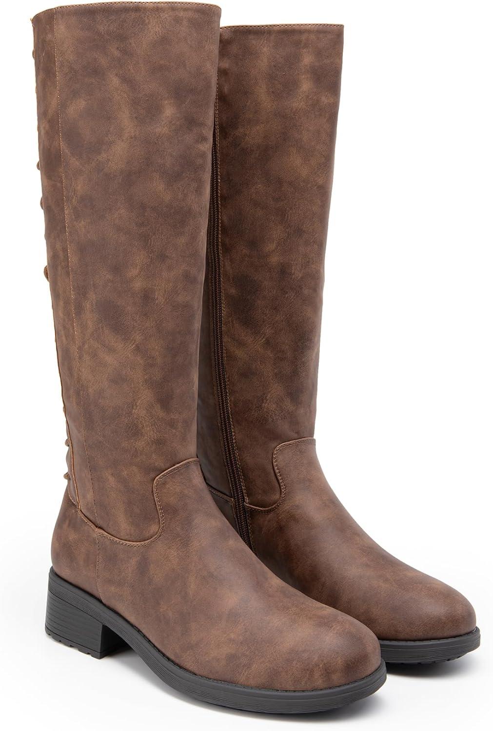 DREAM PAIRS Women's Lace Up Back Knee High Fashion Boots Low Block Heel Riding Boots Round Toe Side Zipper Fall Boots(Tan-nubuck)