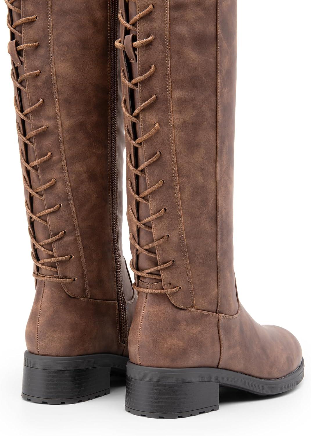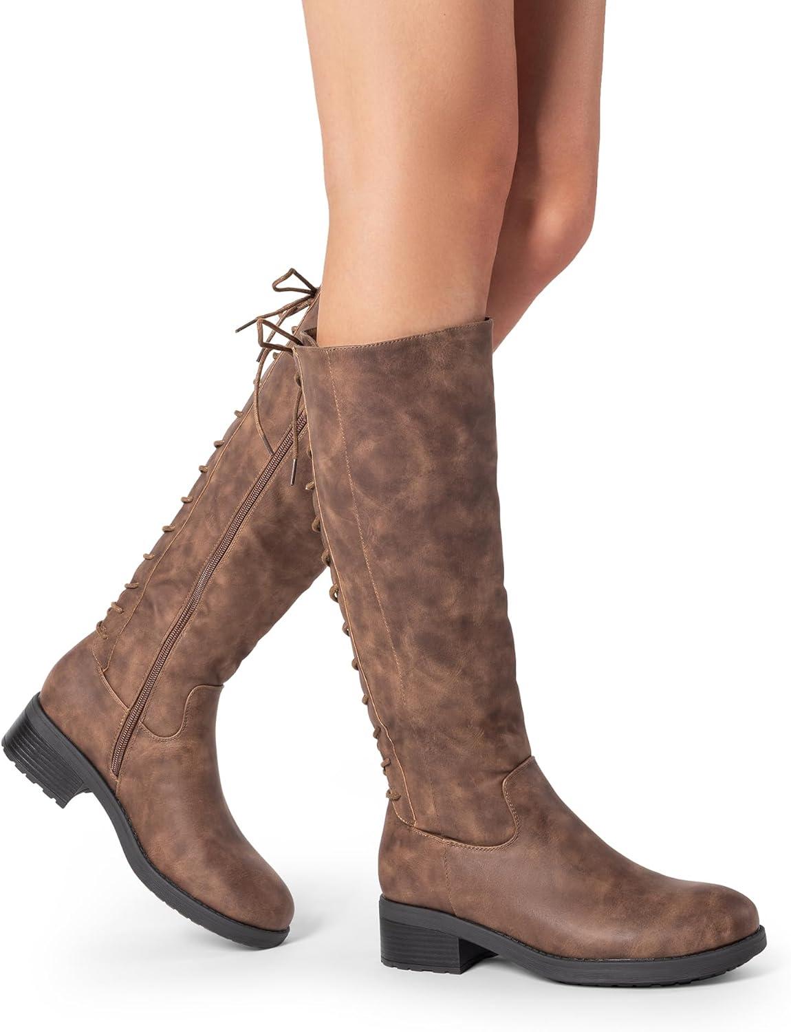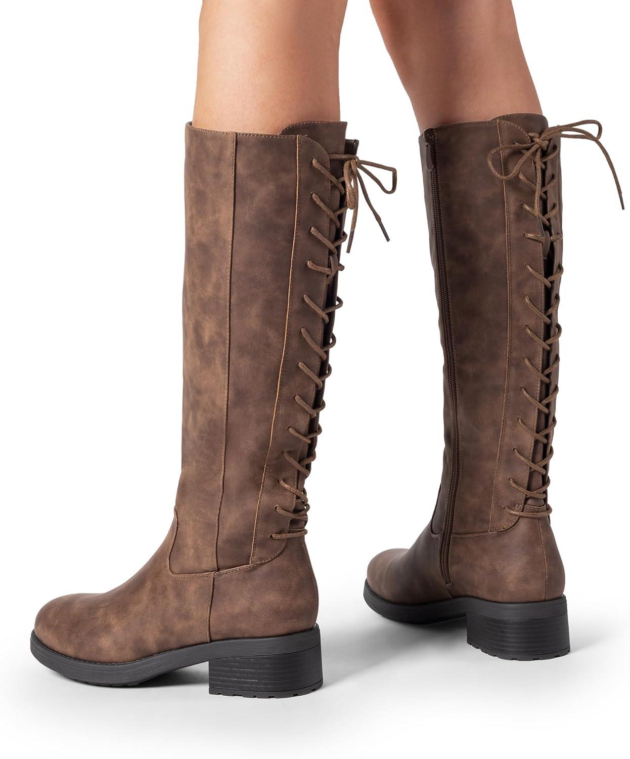 imageDREAM PAIRS Womens Lace Up Back Knee High Fashion Boots Low Block Heel Riding Boots Round Toe Side Zipper Fall BootsTannubuck