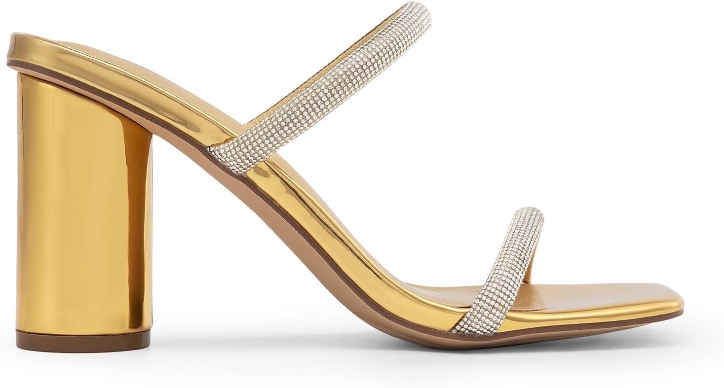 DREAM PAIRS Women’s Square Open Toe Block Heels Two Strap Slip On High Heeled Slides Sandals(Gold-rhinestone)