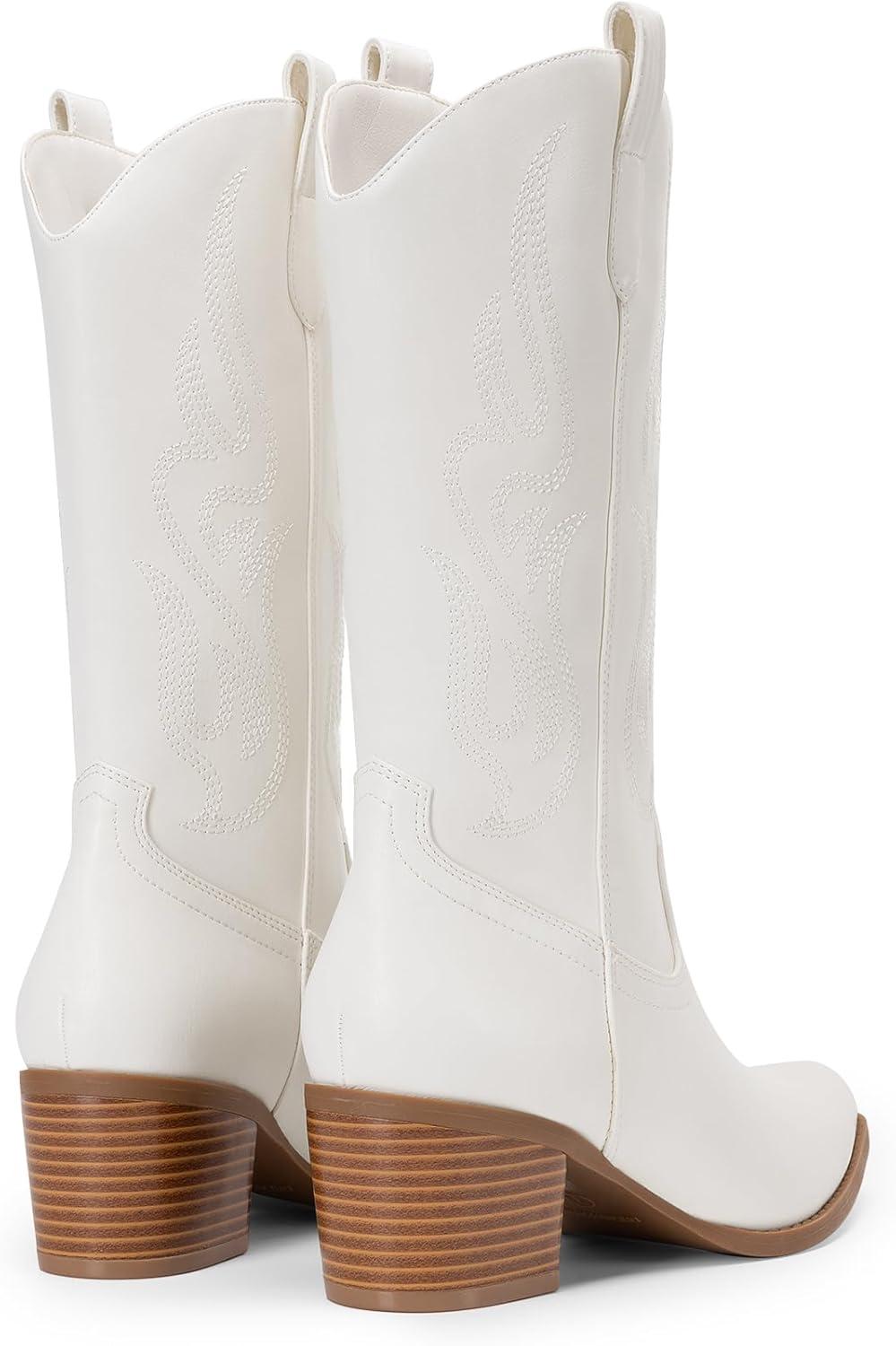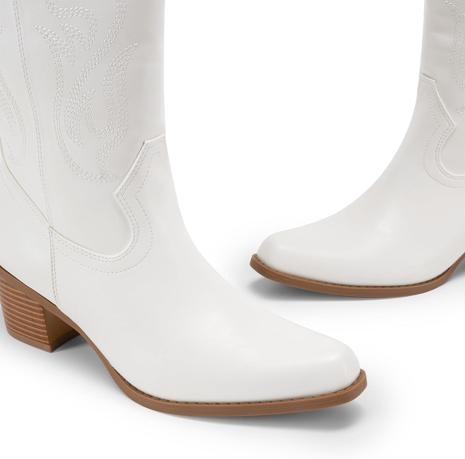 DREAM PAIRS Women’s Square Toe Cowboy Mid Calf Western Boots(White-pu)
